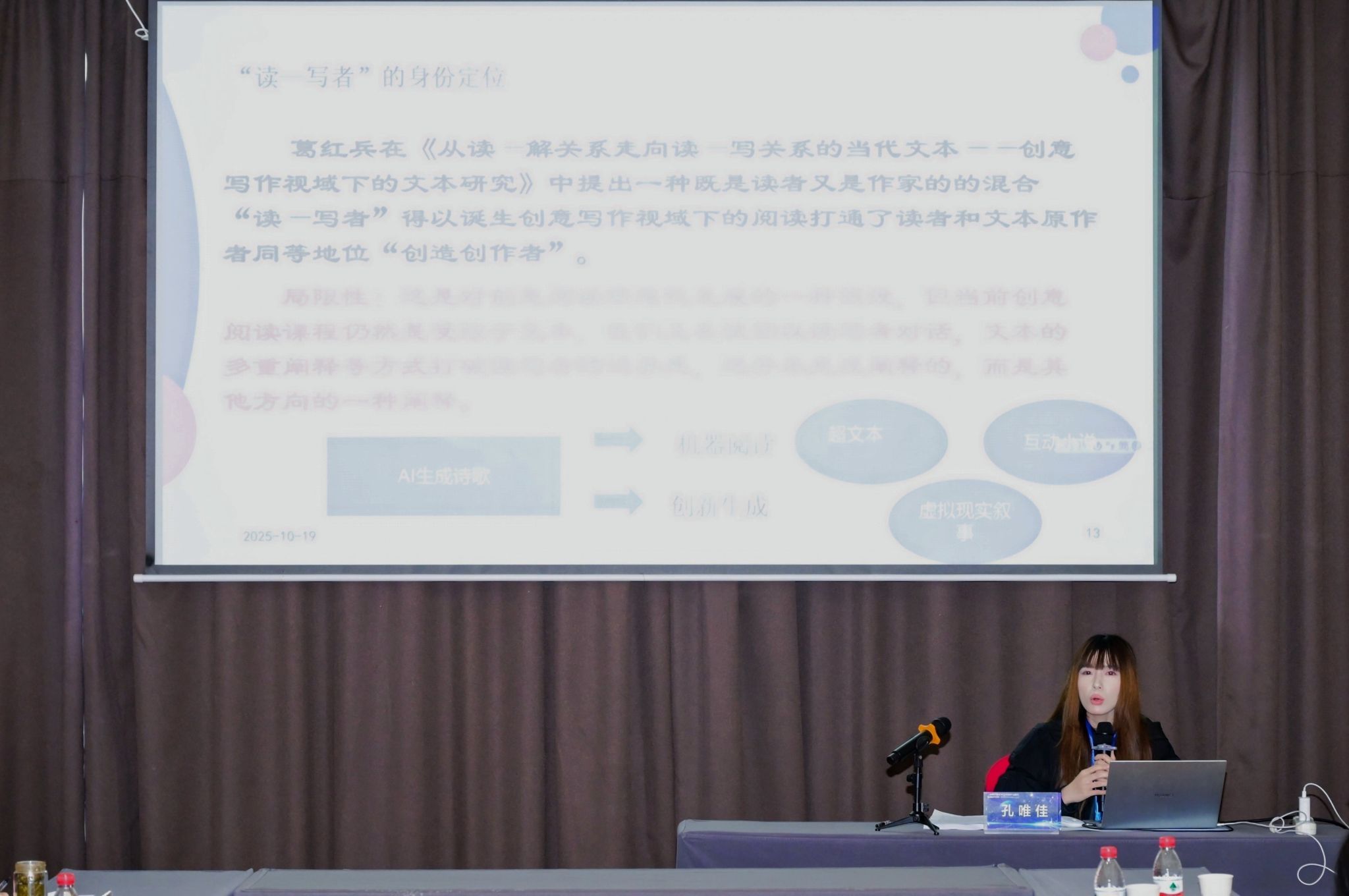10月18日,为期两天的“AI时代的文学艺术创作与研究”国际学术会议在武汉拉开帷幕。我校创意写作学院教师孔唯佳应邀参会并在第二分会场作《电子数字媒介时代下“创意”本位的阅读范式 ——基于创意写作视域的创意阅读》学术报告。