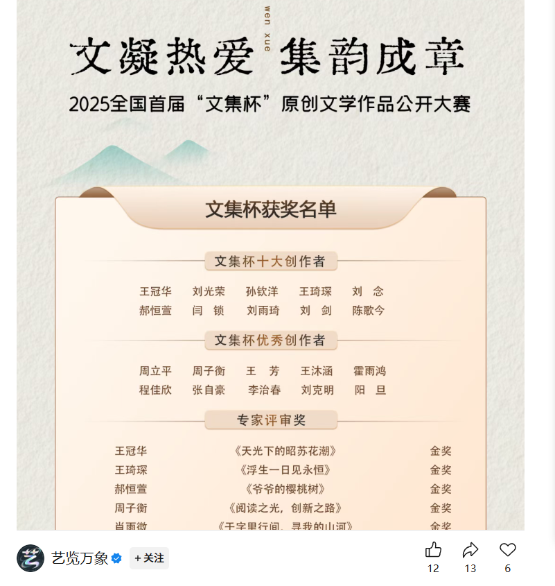 近日,2025全国首届“文集杯”原创文学作品公开大赛正式揭晓结果。该赛事由原创文学统筹组委会主办、北京艺览万象文化艺术中心承办,泰山科技学院创意写作学院青鸟作家班学员郝恒萱凭借作品《爷爷的樱桃树》脱颖而出,斩获全国年度文学赛事金奖奖项,同时获得“文集”十大创作者称号,中国地质大学教授阙建华为作品倾情点评。