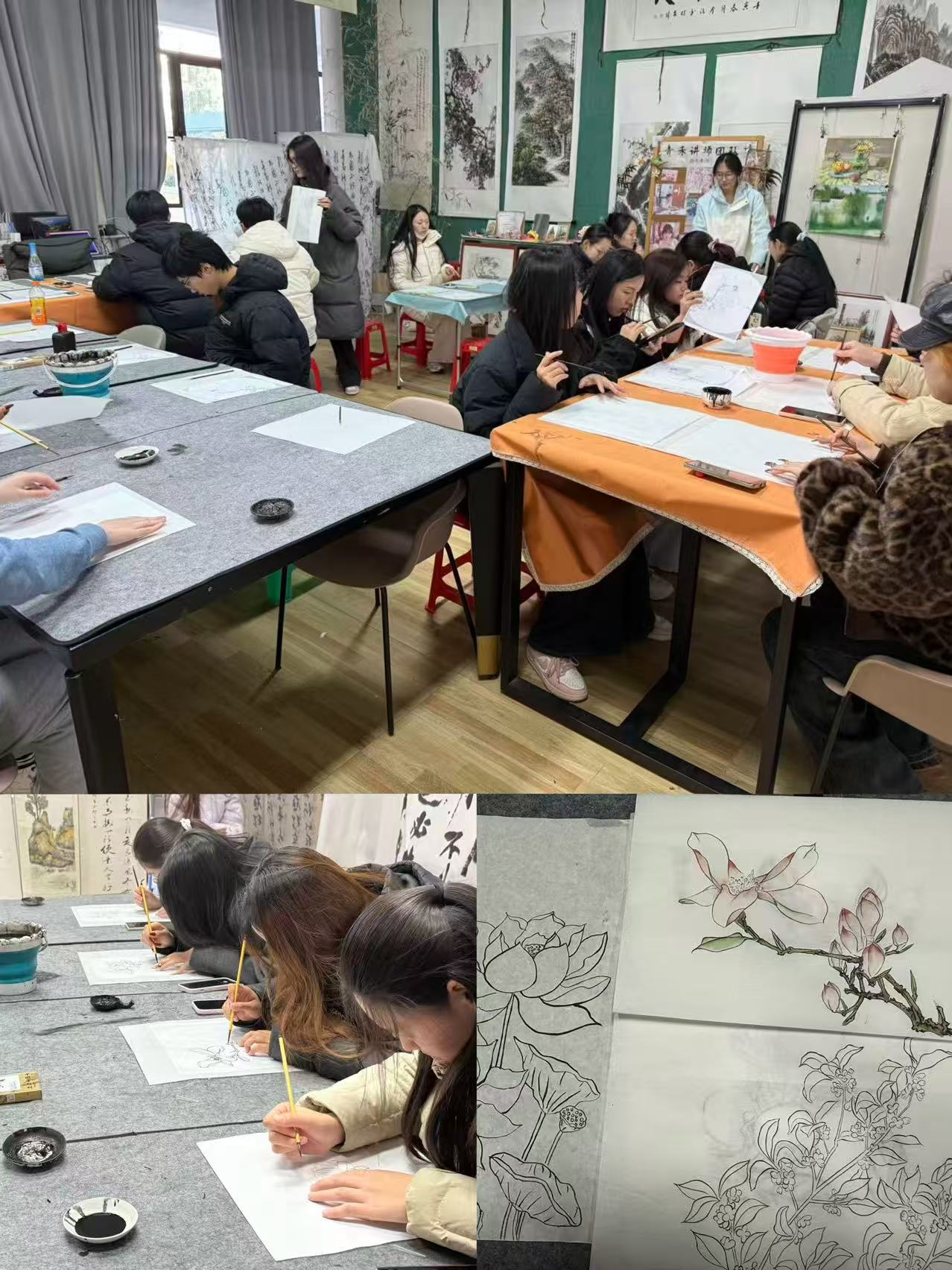 诵读环节过后,同学们移步汶阳书院逸雅堂国画工坊,开启国画创作体验。两位老师现场指导,从笔墨运用、色彩搭配到构图技巧,耐心解答同学们的疑问。大家以《诗经》中的植物为灵感,挥毫泼墨,悉心勾勒。不多时,一株株灵动的荇菜、一片片飘逸的蒹葭、一朵朵娇艳的桃花在画纸上绽放,每一幅作品都承载着同学们对经典的理解与对艺术的热爱,栩栩如生,意趣盎然。