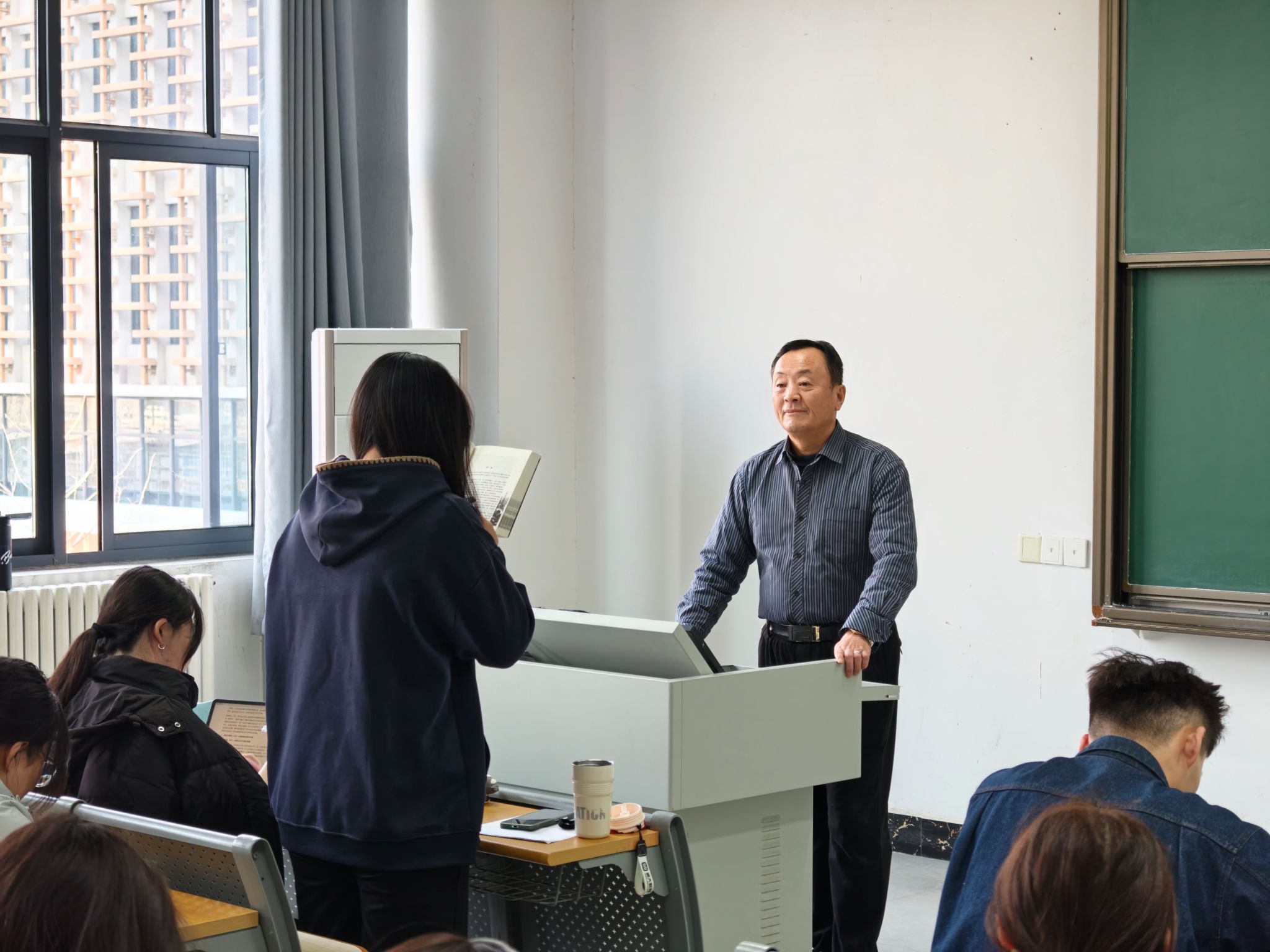 赵书林老师结合创意写作课程目标,阐述了《三体》在文学创作中的借鉴价值,强调其宏大世界观构建、深刻人性探讨与独特叙事手法,对提升学生写作想象力与思想深度具有重要意义。随后,赵老师选取《三体》中“黑暗森林法则”相关经典段落进行领读,通过语调起伏传递文字背后的张力,引导学生体会科幻文学的叙事节奏。