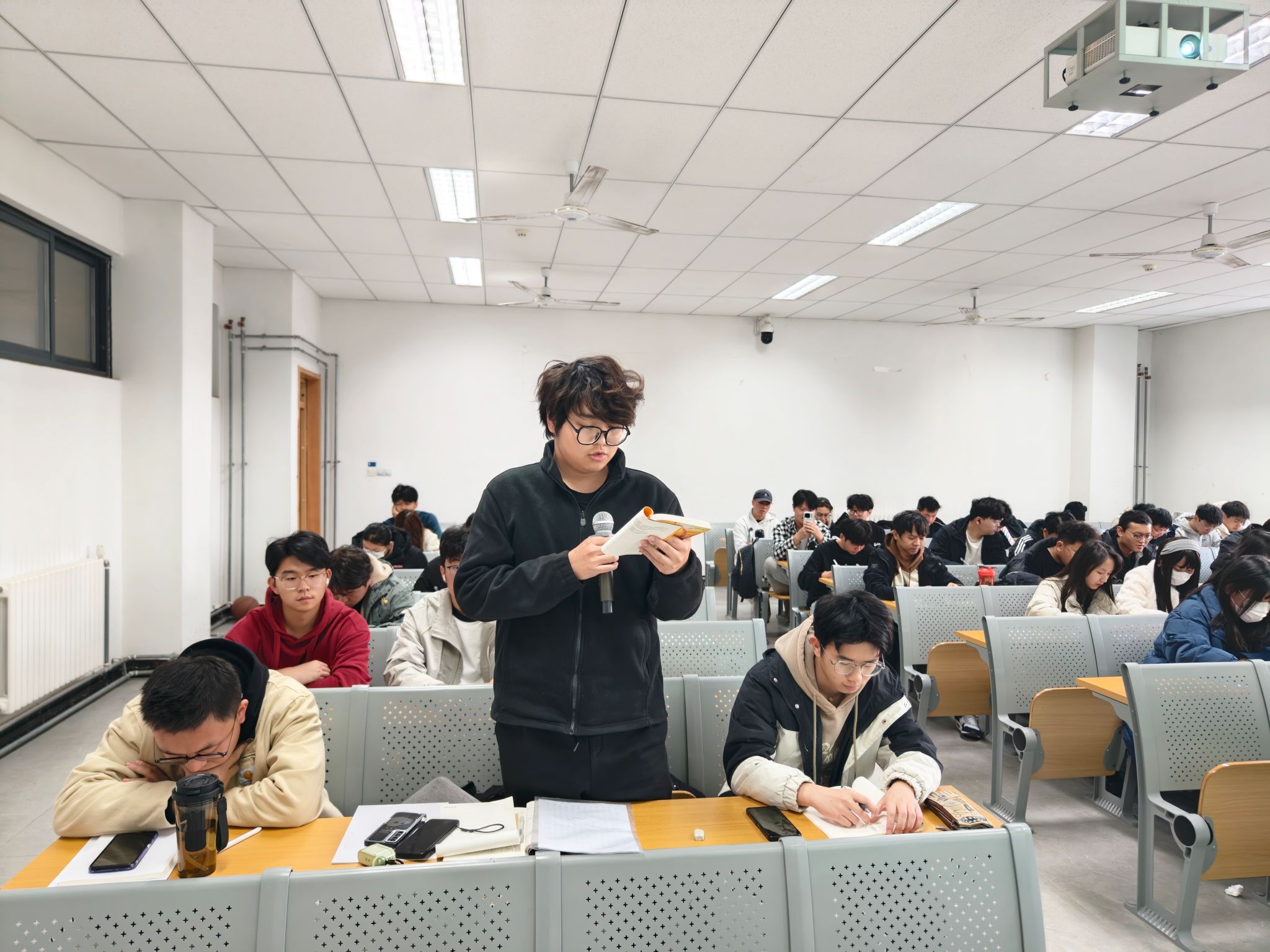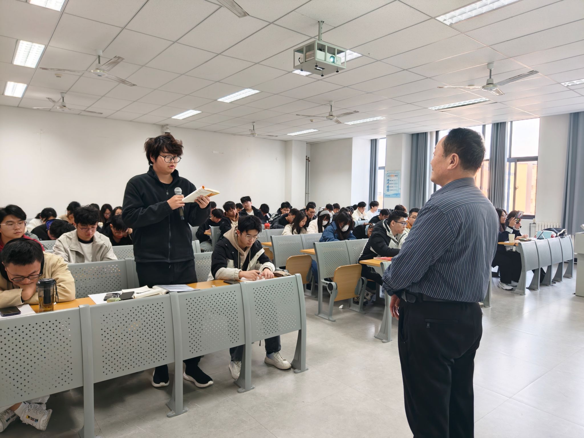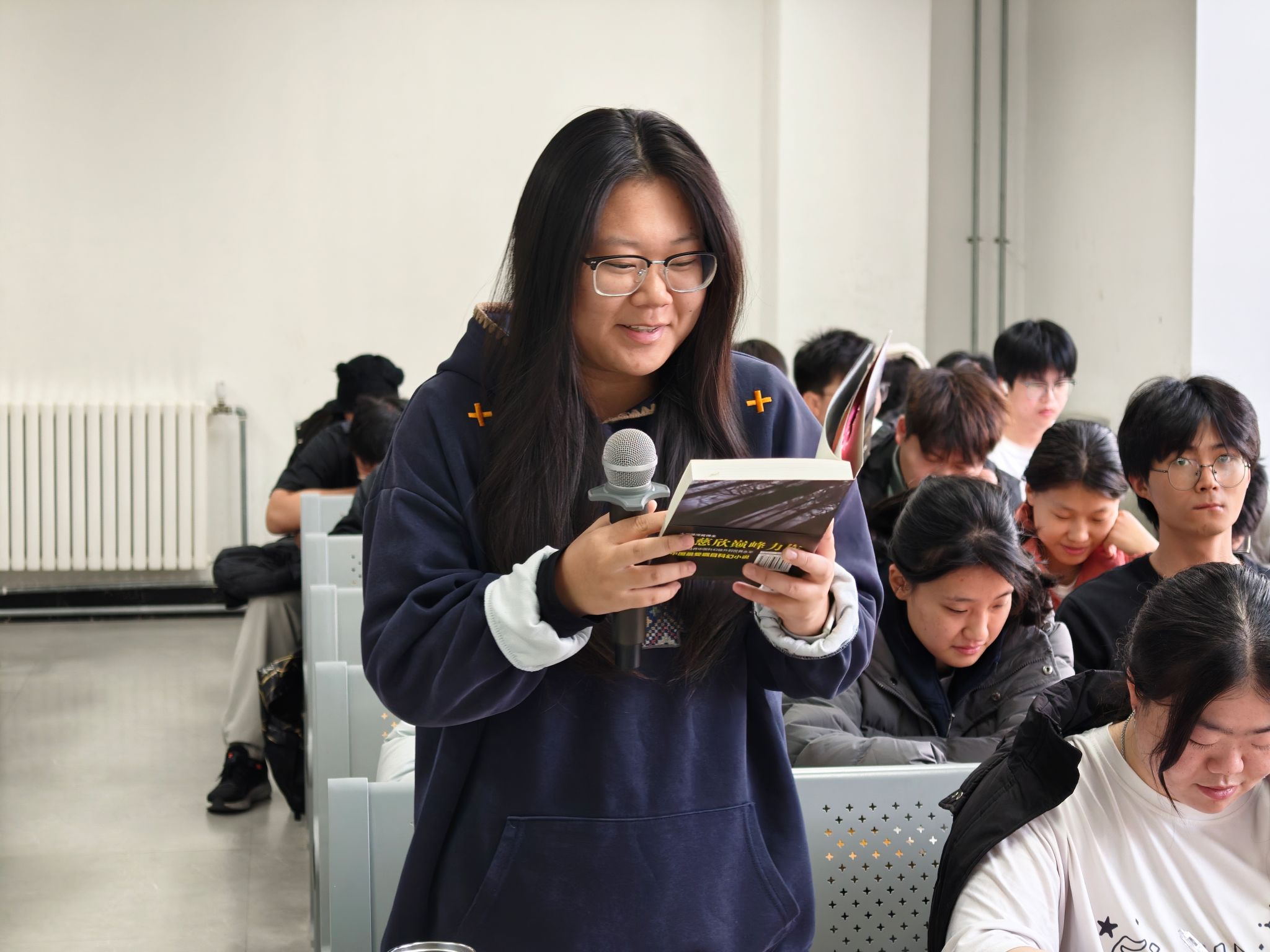 活动伊始,两名学生代表紧接着分别选取小说中“古筝行动”“面壁计划”等富有画面感的章节进行领读。领读过程中,两名学生结合自身阅读感悟,分享对角色塑造、情节设计的理解,引发课堂热烈讨论。