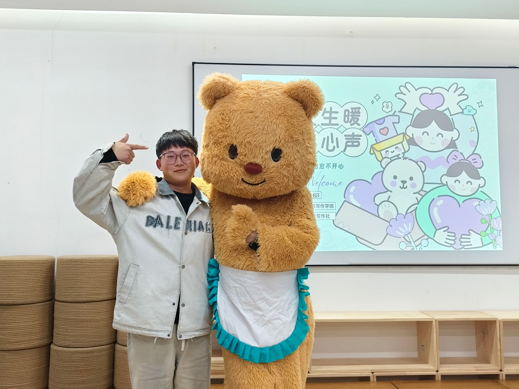 活动尾声,大家抱着可爱的黄油小熊玩偶,举着自己的作品合影留念,脸上洋溢着轻松与满足的笑容。此次活动以“治愈小熊”为情感纽带,将抽象的自我关怀具象化,让同学们在一系列充满趣味与温度的环节中,完成了从自我审视到自我拥抱的心灵旅程。