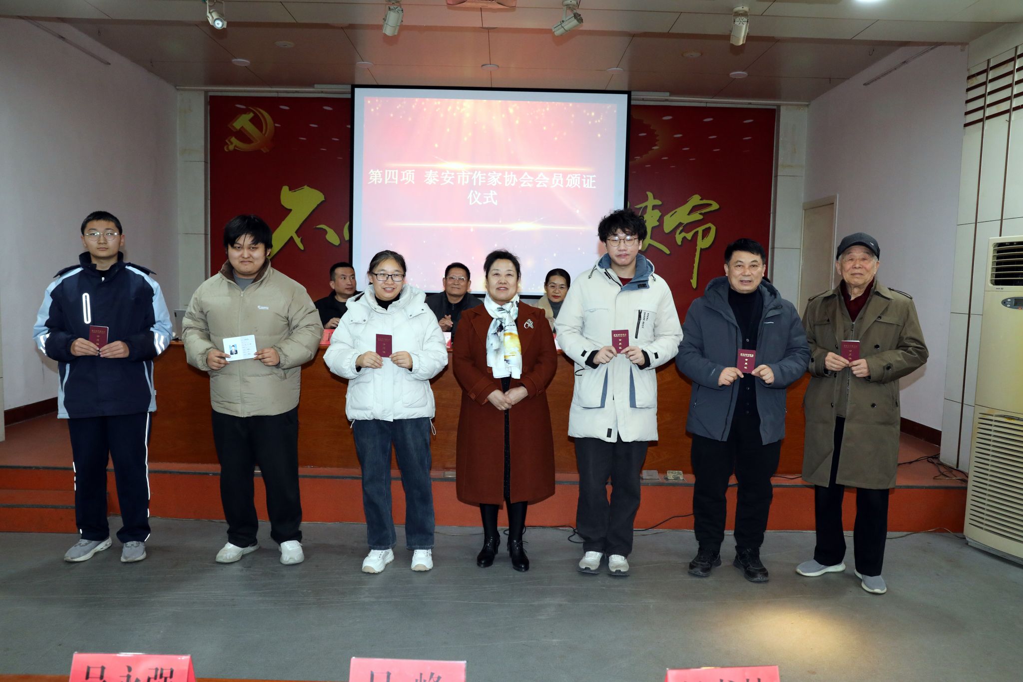 文学交流会上举行了两项庄重而富有意义的颁证仪式,体现了文学事业的代际传承与新鲜血液的注入。在热烈的掌声中,齐欣主席为泰山文学院院聘作家孙庆浩颁发了聘书。随后,泰安市作协创联部主任贾福英为近期新加入泰安市作家协会的泰山科技学院学生刘佳豪、郝恒萱等6名会员代表颁发了会员证。这两项仪式不仅是对作家们创作成绩的认可,更是一份沉甸甸的责任与期许,象征着文学薪火在东平这片沃土上生生不息地传递。