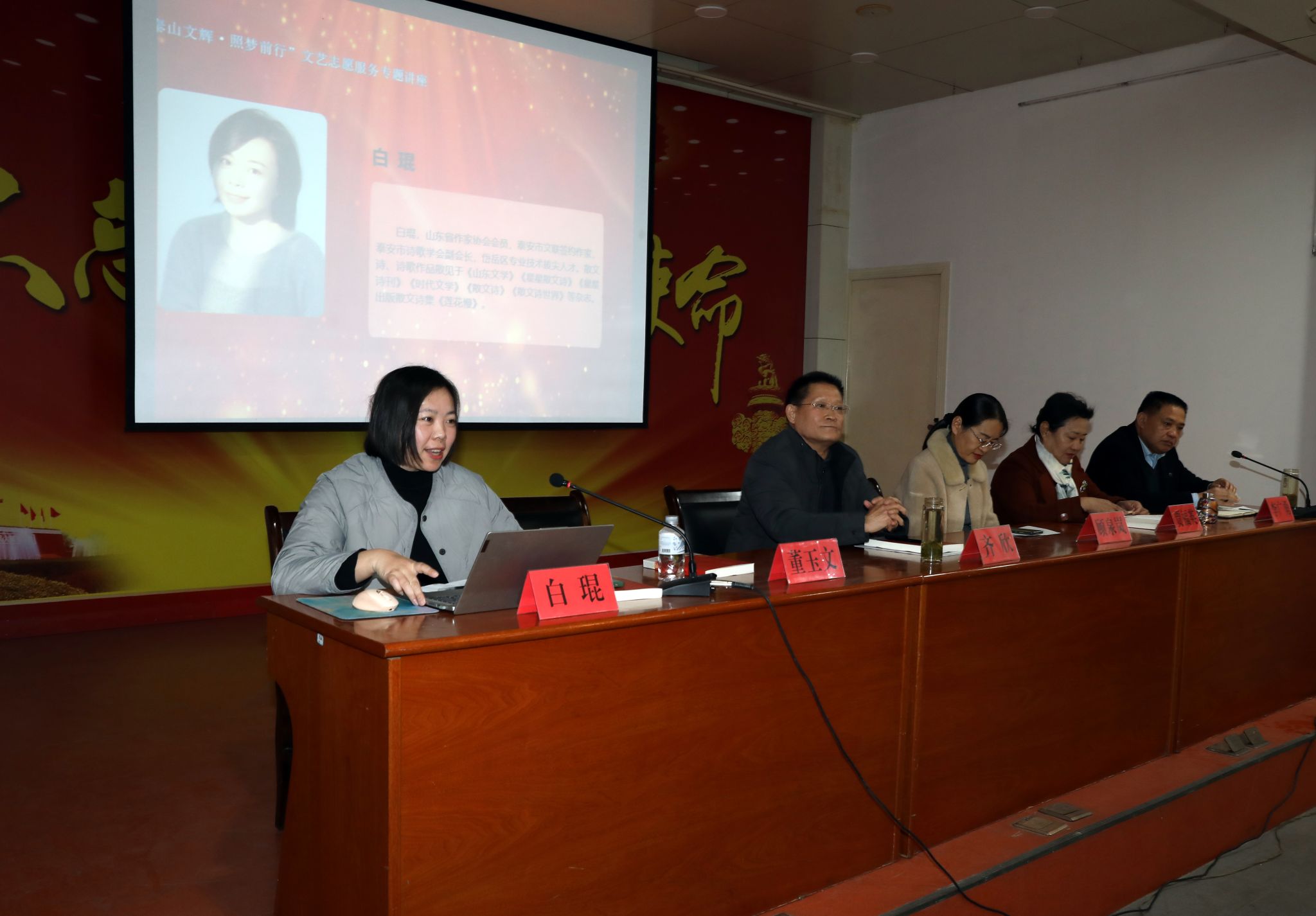 颁证仪式后,“泰山文辉·照梦前行”文艺志愿服务讲座为与会者带来了一场知识的盛宴。齐欣主席首先围绕“深入生活与文学创作”的主题,结合自身创作实践与理论思考,阐述了如何从生活中捕捉细节、提炼主题,以及文艺工作者在志愿服务中如何实现价值引领与文化赋能。随后,泰安市诗歌学会副会长白琨老师以诗意的语言,分享了诗歌创作如何从地域文化、个人体验中寻找灵感,以及诗歌在润泽心灵、服务社会中的独特作用。两位老师的讲座篇幅精炼而内涵丰富,既有理论高度,又有实践温度,为在场的青年作家和学子们带来了深刻的启发与思考。