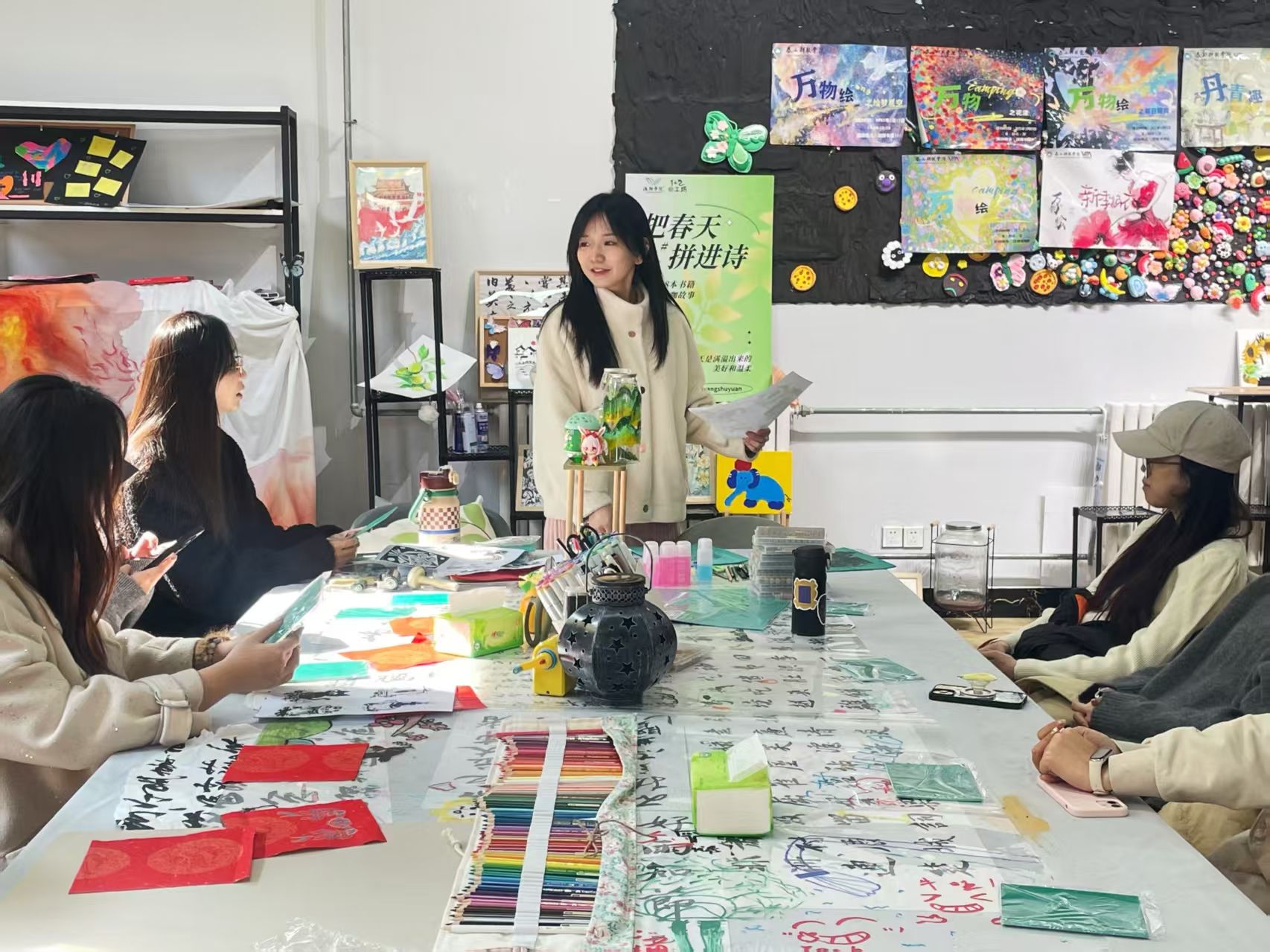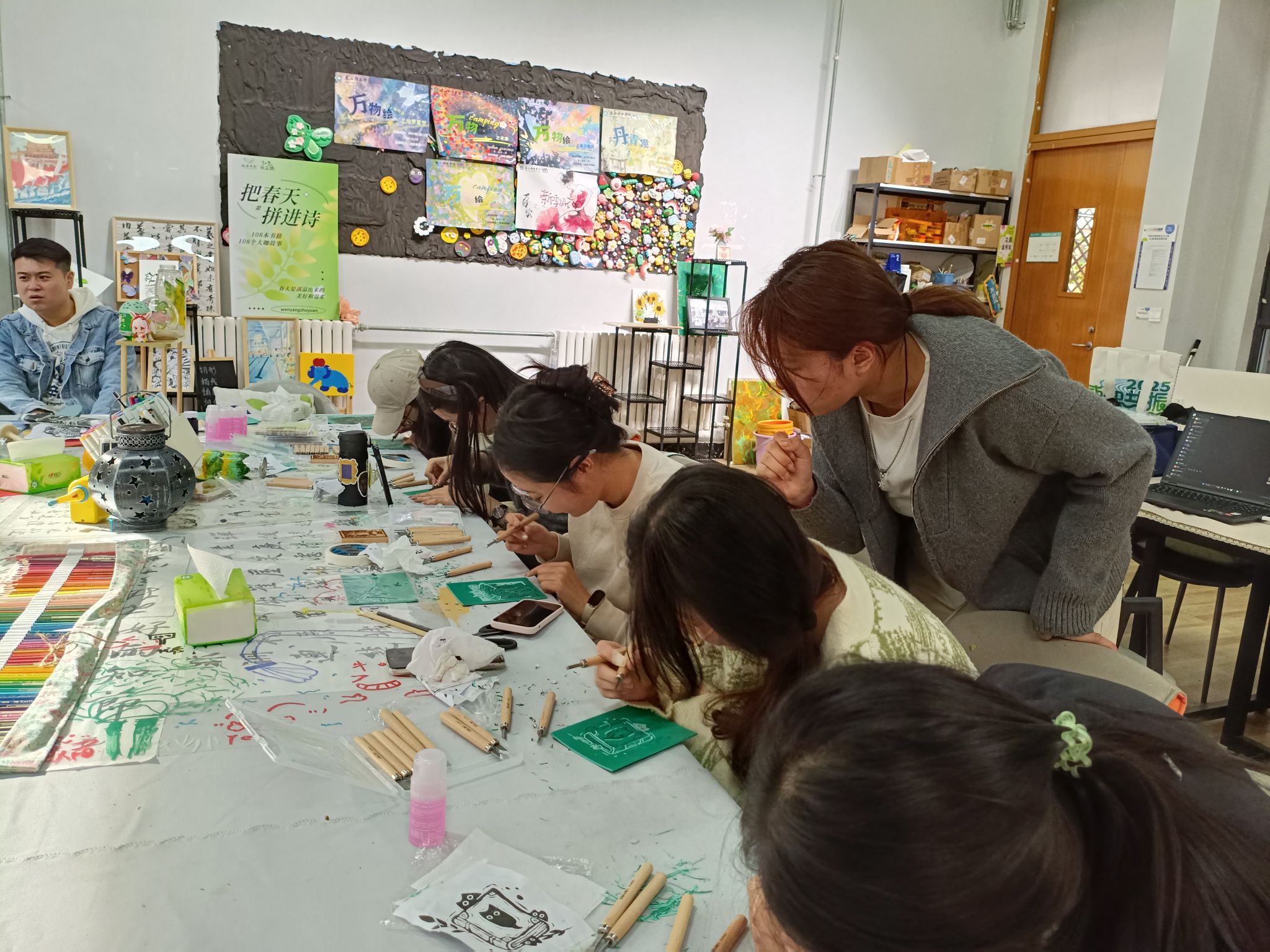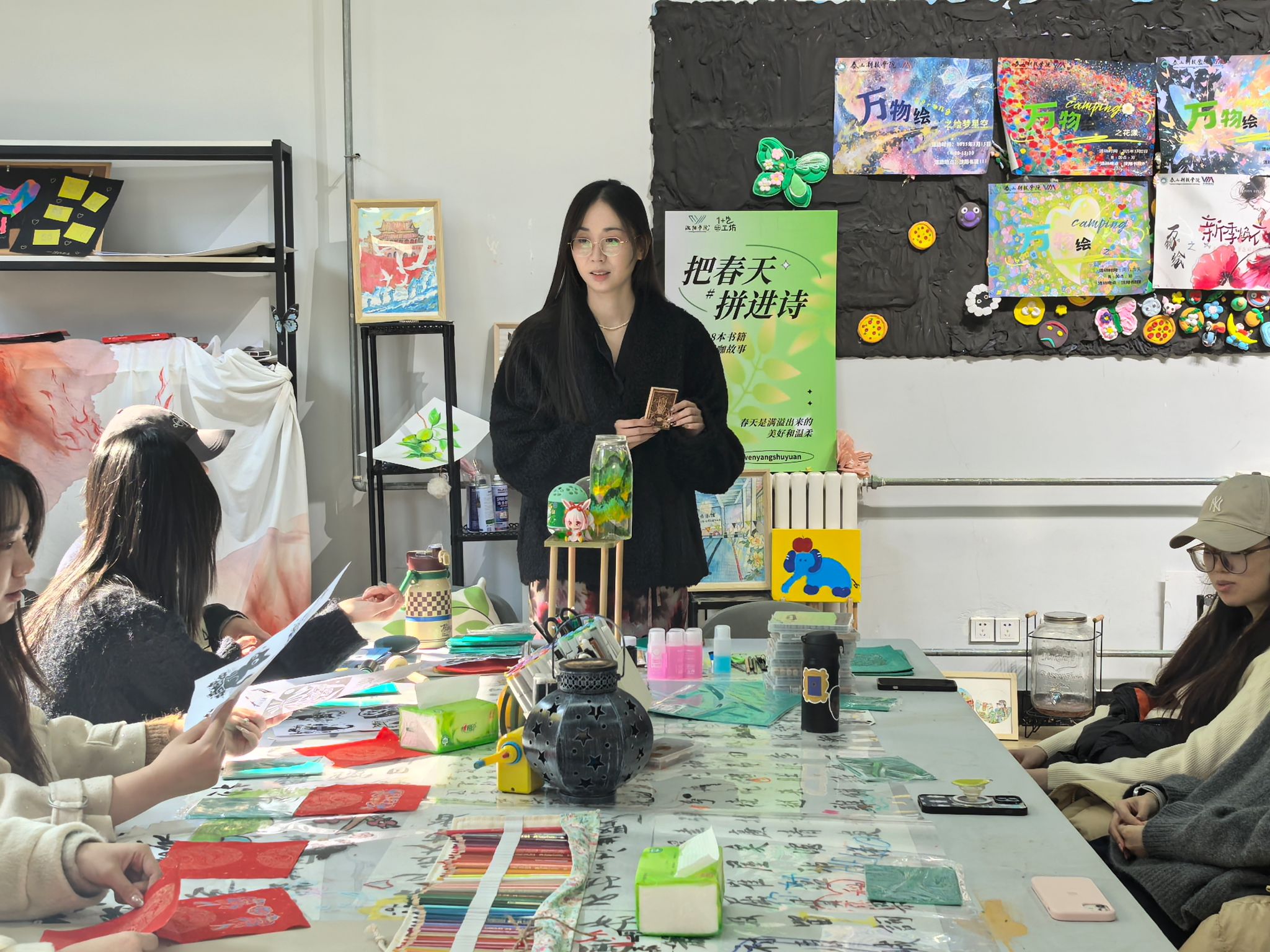 活动尾声,王慧老师举起一幅墨香未干的《和合二仙》,欣慰地说道:"今天看到十几位同学齐聚一堂,每张工作台前都洋溢着专注与热情。非遗传承需要的就是这样薪火相传的温度——当大家的拓印作品挂满整面墙时,我看到了传统文化在年轻群体中生根发芽的希望。"现场完成的近百幅作品不仅展现了甲马艺术的独特魅力,更有参与者将传统图案创新应用于现代明信片设计,让古老的信仰符号焕发出时代新意。