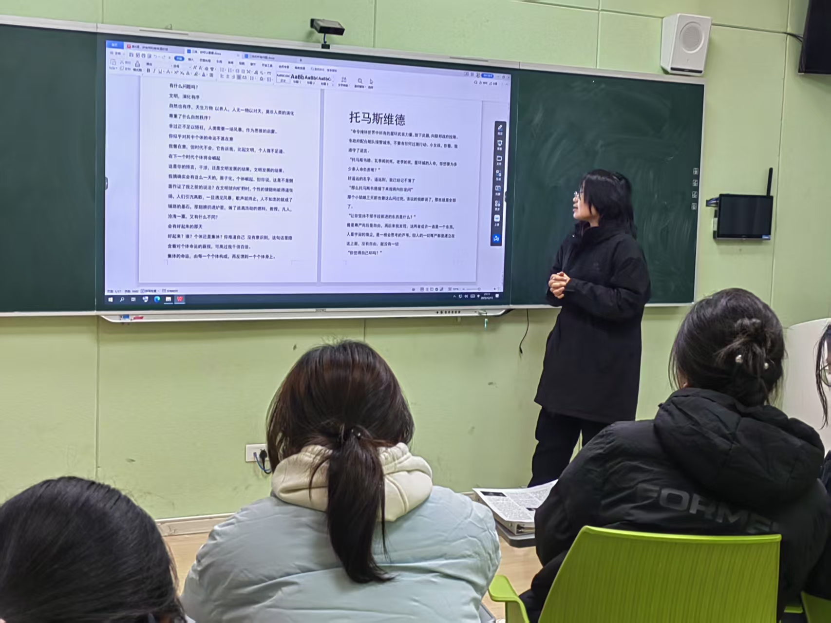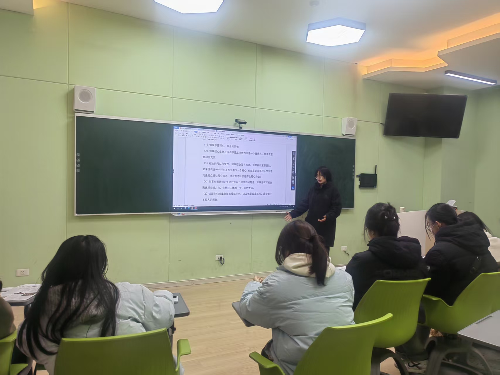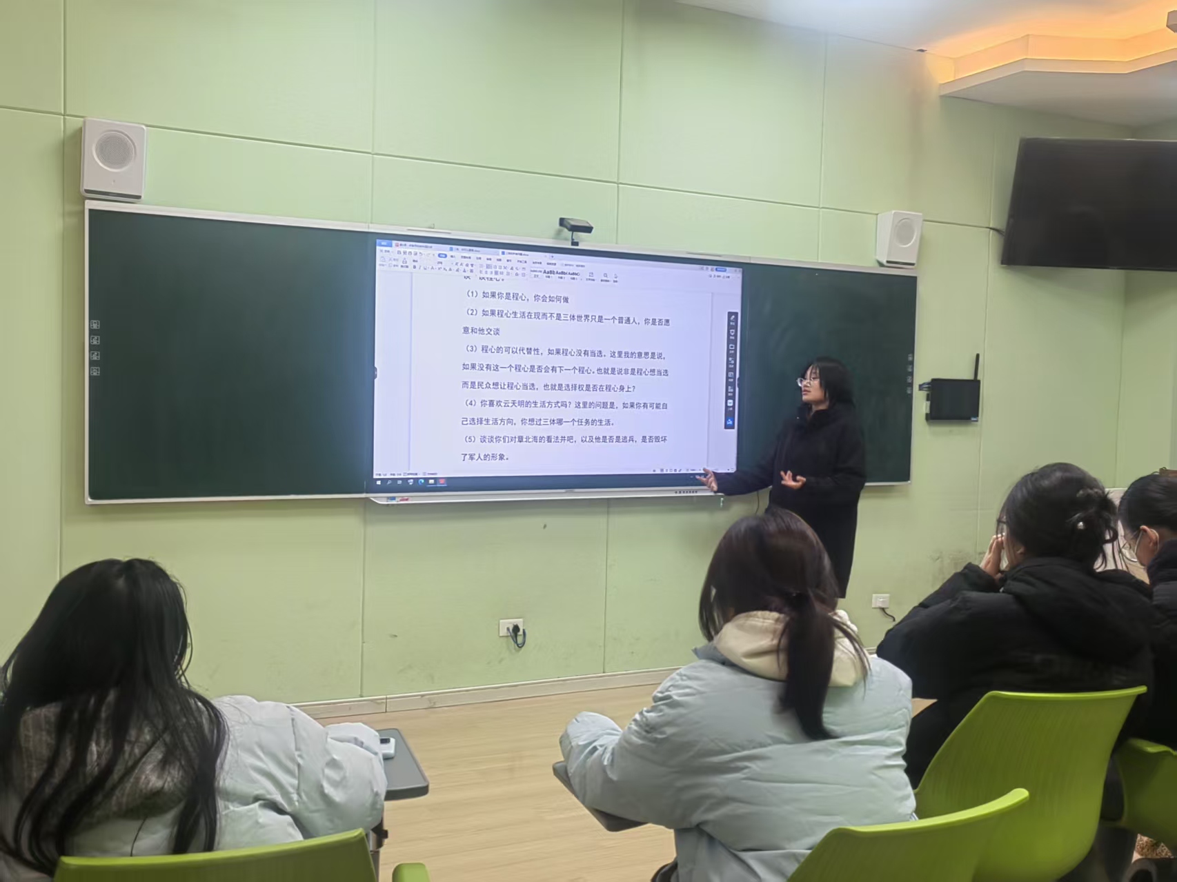 “如果你是程心,你会怎么做”,她提出“宇宙生存法则与人类道德底线的冲突,是程心面临的核心困境”,并引导同学们思考“极端环境下,道德与文明存续的平衡之道”;谈及“若是程心生活在现实世界,是否愿意与她交谈”,有人认为程心身上的善良、真诚与同理心,在现实生活中极具个人魅力,“她的处世态度能给带给我们温暖与反思,是值得交往的对象”;关于“程心的可替代性”,张宇宣给出了深刻见解:“程心的当选并非偶然,而是民众在特定时代背景下对‘善良与和平’的渴望与选择,即使没有这个程心,也会有承载着相同民众意识的‘下一个程心’,选择权本质上掌握在民众手中”;而在解读“程心与云天明、关一帆的感情结局”时,她重点引导同学们站在云天明的视角共情思考,“若失去记忆经历剧情,记忆回归之后——是遗憾、是愤怒、还是释然”