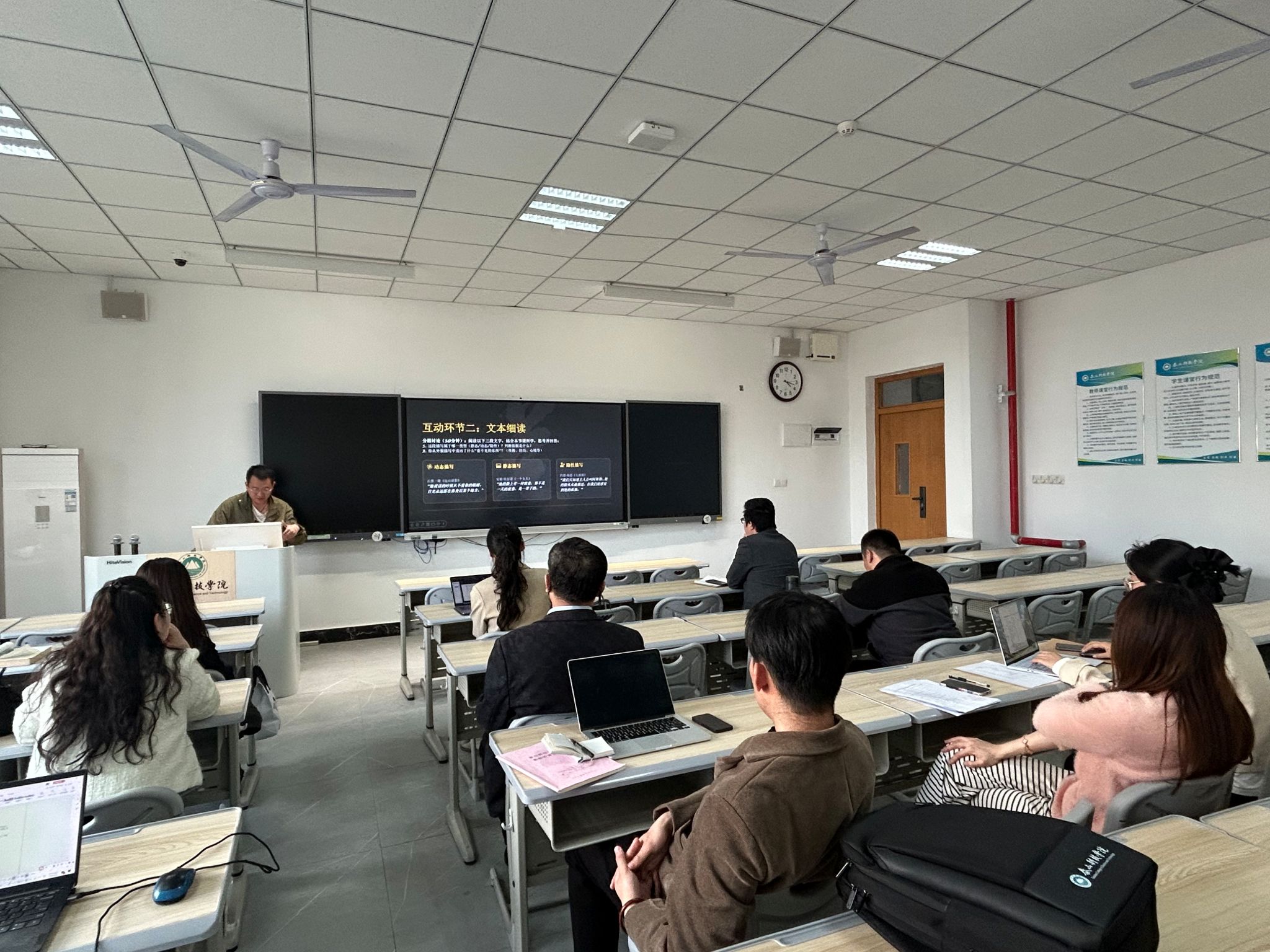 说课环节结束后,教师们逐一交流发言,结合两位老师的说课内容分享听课心得与教学思考,对照自身教学实践查摆不足、交流经验,在思想碰撞中凝聚教学改进共识,为后续创意写作课程提质增效筑牢基础。