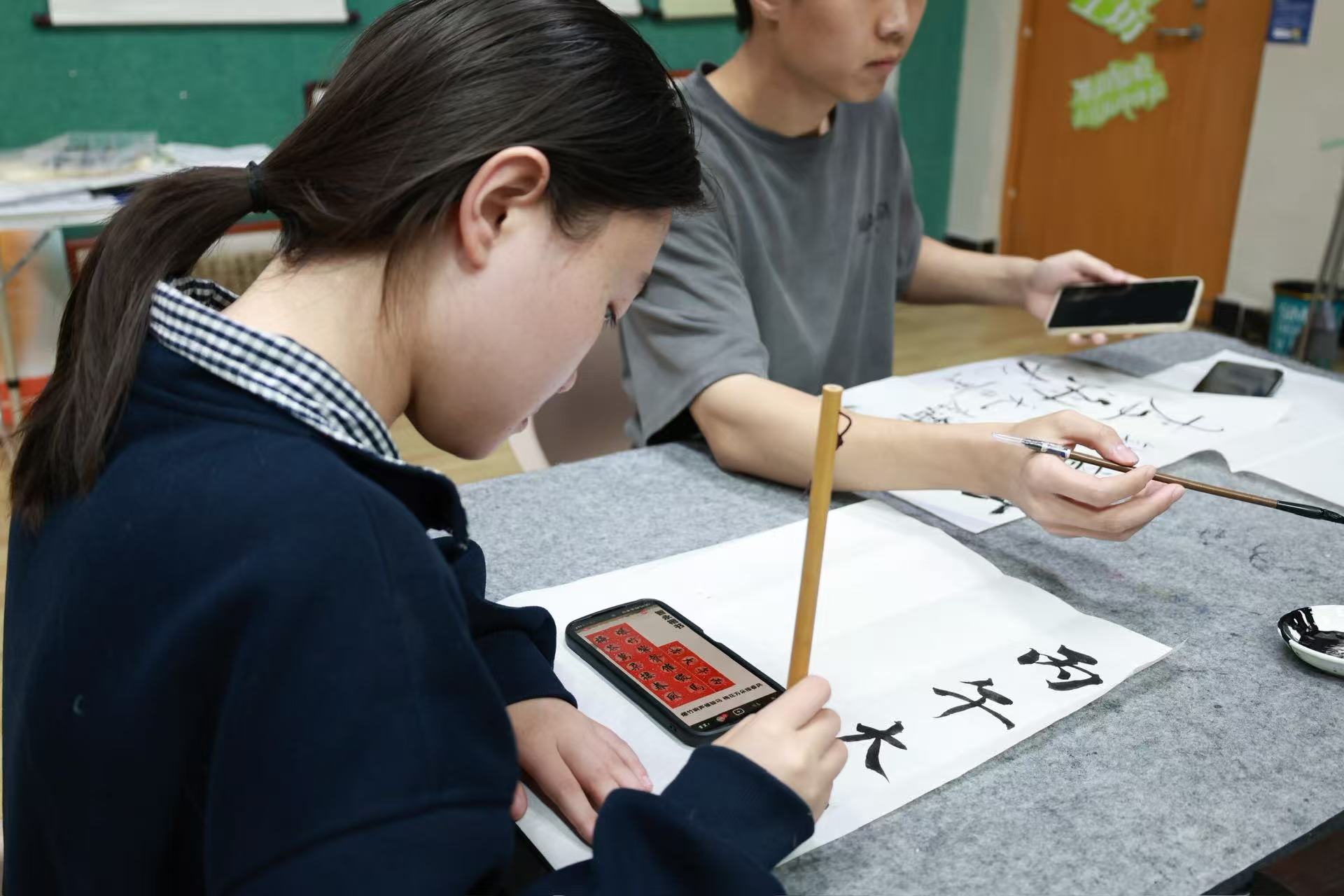 技法教学结束后,同学们正式开启自主创作。大家屏息凝神,手握毛笔,蘸取浓淡相宜的墨汁,在宣纸上细细勾勒、慢慢铺陈。或临摹经典碑帖,力求形神兼备;或结合所学创作短句,书写心中所想,每一笔都饱含认真,每一字都尽显巧思。
